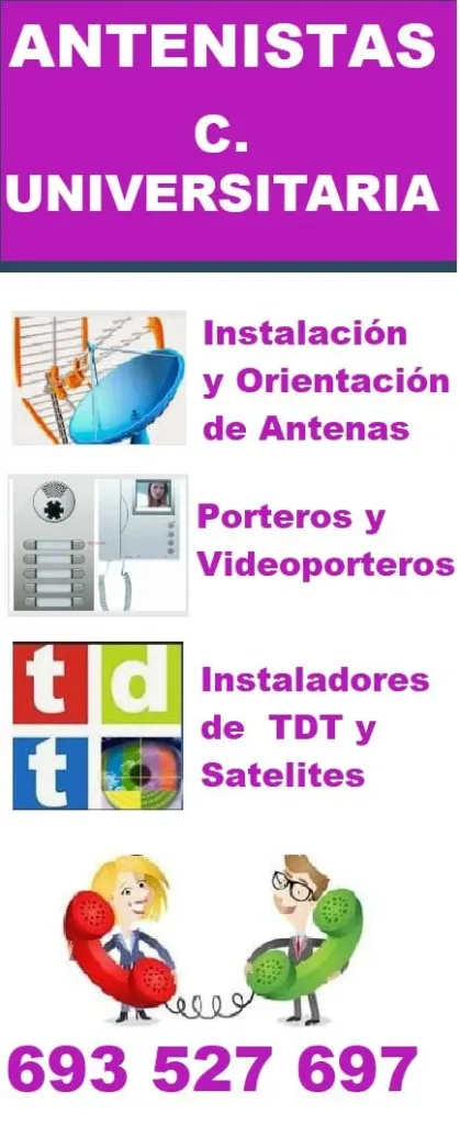 Somos una empresa de Antenistas TDT Ciudad Universitaria que dispone de una dilatada experiencia en la reparación de antenas Ciudad Universitaria, así como en la instalación y reparación de TDT. Además de dedicarnos a los servicios con cualquier tipo de antenas (antenas individuales y colectivas), también nos encargamos de la reparación porteros automáticos Ciudad Universitaria, instalación de TDT y Canal +, videoporteros, etc. También somos una empresa de reparación de antenas parabólicas Ciudad Universitaria con los precios más baratos del mercado.